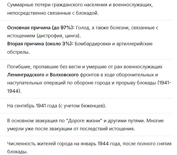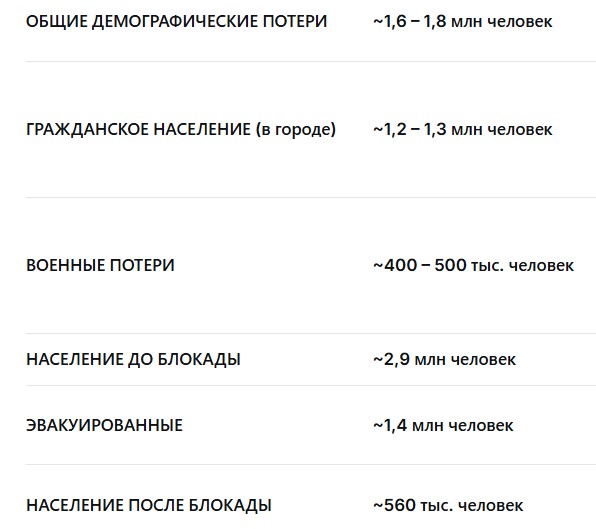 Осада, начавшаяся 8 сентября 1941 года, была полностью снята 27 января 1944 г., что сделало её одной из самых продолжительных и дорогостоящих (с точки зрения человеческих жизней) осад в мировой истории. Считается, что во время осады погибло около 1,2 миллиона человек — это в основном оценка числа погибших от голода, холода и бомбёжек среди гражданского населения. Для наглядности сделал табличку на основе основополагающего коллективного труда под эгидой РАН «Ленинград в осаде. Сборник документов о героической обороне Ленинграда в годы Великой Отечественной войны. 1941—1944» (Архивный комитет Санкт-Петербурга и др.). Также «Население Ленинграда в годы блокады» — фундаментальные исследования демографов, основанные на отчётах УНКВД, управлений здравоохранения и похоронных служб. Ключевые авторы в этой области: В.М. Ковальчук, Г.Л. Соболев, Н.Ю. Черепенина.