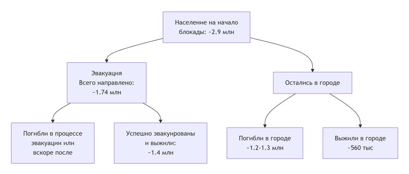 Как до, так и во время блокады советские власти пытались эвакуировать большое количество гражданского населения Ленинграда. Предполагается, что к марту 1943 года было эвакуировано около 1 743 129 человек (в том числе 414 148 детей), что составляло около трети населения города. [В таблице указано число эвакуированных, которые в основном выжили.] Не все эвакуированные спаслись: многие погибли во время бомбардировок и от голода, охватившего окрестности. Вот ещё одна табличка: