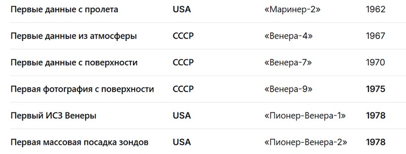 Кстати, у американцев была своя, очень отличающаяся стратегия изучения Венеры, и их первые успехи пришлись как раз на тот же период. Если советская программа была нацелена на завоевание «первенств» на поверхности, то американская сделала ставку на орбитальные аппараты и детальное картографирование. Вот для примера табличка для более полного понимания вопроса: