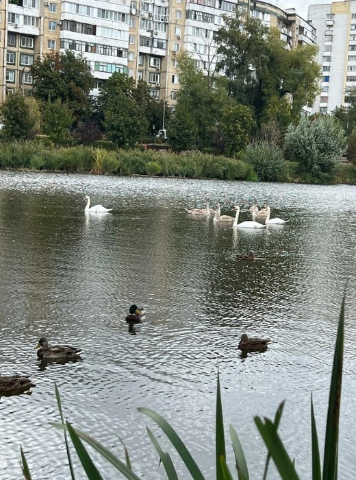 У лебедя, который живёт на Везелке, появились друзья — семья лебедей.