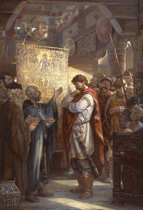Летописцы рассказывают, что Владимир решился «испытать» разные веры. Он принимал послов от мусульман, иудеев, католиков и византийцев. Каждый из них убеждал князя, что его вера — единственно истинная. Мусульмане прельщали богатством и многоженством, но отказ от вина и свинины казался князю слишком суровым: «Руси веселье пити, не может без того быть». Иудеи ссылались на мудрость своих пророков, но Владимир возразил: «Как же вы Бога почитаете, если Он на вас рассердился и землю вашу отдал другим?». В конце концов, именно отчет Владимира о том, как князь Святослав Храбрый — разбил Хазарию, где крепки были позиции иудейской веры, — сыграл роль. Когда часть земли Хазарской досталась Руси: города Белая Вежа (Саркел), Тмутаракань. Наибольшее впечатление на князя произвели византийцы. Их вера сочетала величие обряда и строгость закона, а главное — имела могущественную державу за спиной. Послы, побывав в храме Святой Софии в Константинополе, сказали: «Не знали мы, на небе ли были или на земле, ибо нет на земле такого зрелища и красоты». И можно вполне поверить сообщениям послов, ибо даже сегодня храм Святой Софии поражает своей красотой и размерами, а его купол кажется парящим в воздухе.