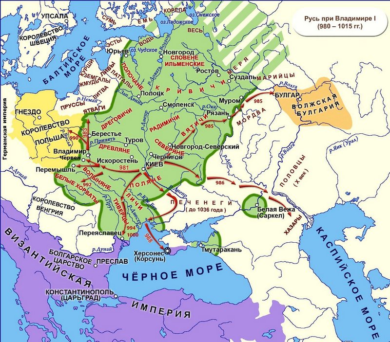 Возвращение Владимира было молниеносным. Варяжская дружина, ведомая молодым князем, шла по волховским и днепровским путям, возвращая ему земли. Новгород открыл ворота, Полоцк был взят штурмом, а его правителя Рогволода вместе с сыновьями казнили. С этим эпизодом связана легендарная история о Рогнеде — дочери Рогволода, которую Владимир взял силой, сделав своей женой. В полоцком походе Владимир проявил себя не только как воин, но и как правитель, умеющий подчинять города и народы. После этого он двинулся на юг, к Киеву. В 978 году Ярополк был осаждён и погиб при загадочных обстоятельствах — то ли от меча варяга Блуда, то ли по тайному приказу Владимира. Так или иначе, младший сын Святослава стал единодержавным правителем Руси.