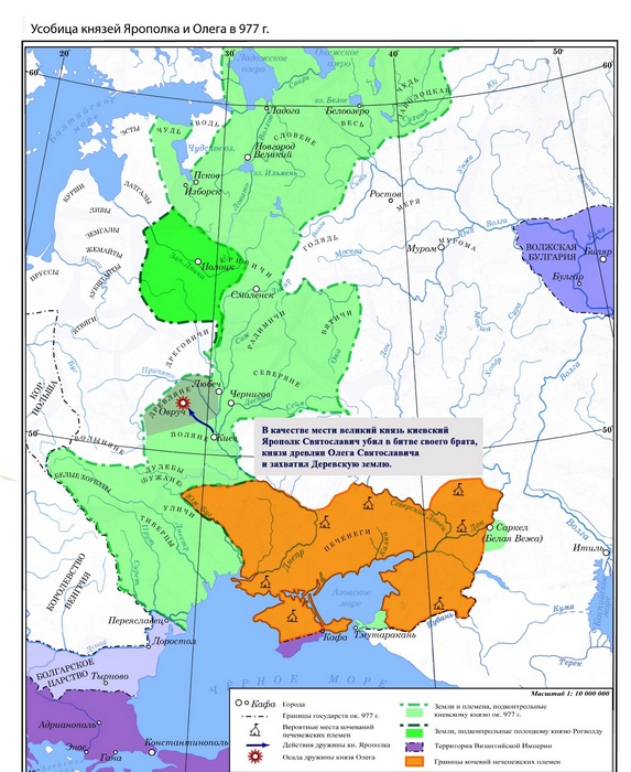 После гибели Святослава в 972 году — в печально известной засаде печенегов на днепровских порогах — власть в Киевской Руси разделили его три сына: Ярополк, Олег и Владимир. Ярополк занял главный престол в Киеве как старший по праву. Средний брат Олег получил древлянскую землю со столицей в Овруче, а младший Владимир — Новгород. Так начался период триумвирата, просуществовавший недолго: каждый из сыновей Святослава стремился к верховной власти, и Русь, ещё недавно грозная и сплочённая под рукой Храброго князя, оказалась на пороге междоусобицы. Поначалу отношения между братьями оставались внешне мирными. Ярополк, сидя в Киеве, сохранял статус старшего и верховного, что признавалось его братьями формально. Однако за этим равновесием скрывалось напряжение. Киевская знать, дружинники и варяжские воеводы не были едины: часть поддерживала Ярополка, часть — Олега, а в северных землях всё сильнее крепла самостоятельность Новгорода, где княжил Владимир.