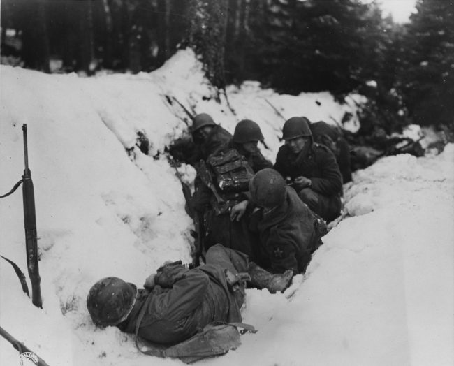 Американские солдаты укрываются от огня в окопе во время боёв в Арденнах