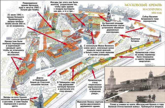 Крыши покрасили в неброские цвета, тоже сделали и с куполами кремлевских храмов, были сняты сильно демаскирующие кресты и красные звезды с башен, сами башни и купола часто покрывали еще и защитными чехлами. Зубцы на стенах замаскировали фанерой, а — Александровский сад сверху стал походить на самый обычный городской квартал. Особенно тщательно скрывали от штурманов немецких бомбардировщиков Мавзолей — его покрыли крепким «чехлом», изображавшим трехэтажное здание.