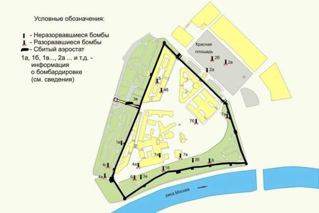 К слову сказать, подобное «шапкозакидательство» нередко, более или менее открыто, используется в пропаганде «лучших друзей что СССР, что России, — злорадно приводящих объективные данные вражеских бомбардировок, содержащихся на более серьезных сайтах патриотического характера. Согласно которым только Кремль бомбили с июля 1941 по март 1942 года восемь раз — при этом было сброшено 15 фугасных, две осветительные, 151 зажигательная и одна наливная бомба (200-литровая бочка с нефтью). Например, 29 октября 1941 г. в 19:22 в Кремль, на территорию двора Арсенала, была сброшена бомба фугасного действия (предположительно весом в 500 кг). Этот налет принес самые большие потери среди личного состава. Пострадали 146 человек, из которых 41 погибло. Общая схема попадания в Кремль немецких бомб изображена, например, на этом рисунке:
