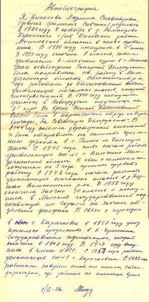 «После 9-го класса окончила шестимесячные учительские курсы в городе Могилеве и была направлена на работу в Воложинский район тогда еще Молодечненской области (впоследствии Минской)».