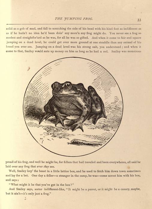 А ведь начиналось всё — с рассказика о необыкновенной лягушке: «Знаменитая скачущая лягушка из Калавераса»; весёлый рассказ о чудаке, долго тренировавшем свою лягушку, чтоб в воздухе переворачивалась, всякие финты выделывала; а потом, заключая пари, выигрывал всегда, чуть обогащаясь. Весёлый рассказ, добрый, чуть грустный, — замеченный всей читающей Америкой: так появился Твен. Так стал известен.