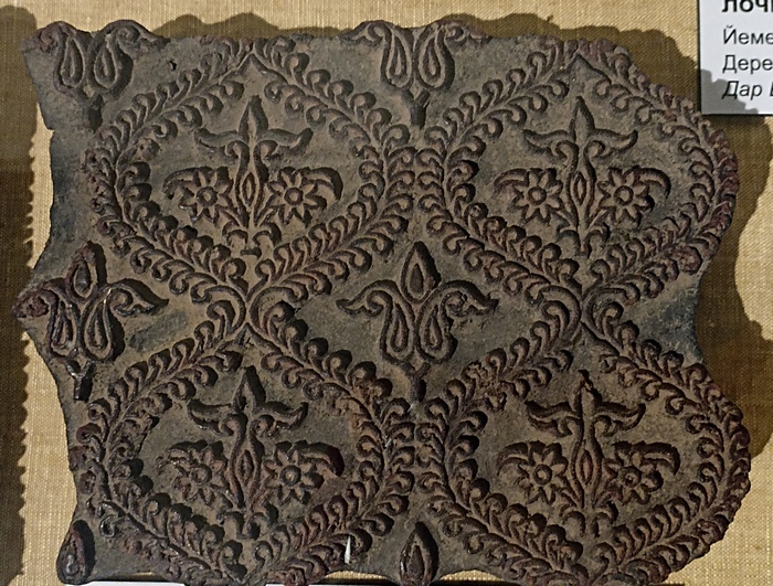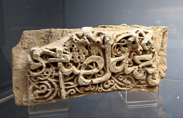Фрагмент панно — средняя часть свода (или арки). Высоким рельефом выполнена арабская надпись с заполнением между буквами в виде мелкого растительного орнамента, выполненного более низким рельефом.