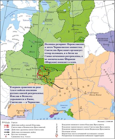 Важнейшей задачей Святослава, как и других князей того времени, была борьба с половцами. Первое крупное столкновение произошло в 1060 году, когда Ярославичи выступили совместным походом: «И собравше войско великое, и идоша на половцы, и побегоша те, и гнаша их до реки Сула». Эта победа закрепила авторитет братьев, особенно Святослава, чьи владения непосредственно граничили со степью. Однако уже в 1068 году половцы нанесли ответный удар и разгромили объединённое войско на реке Альте.