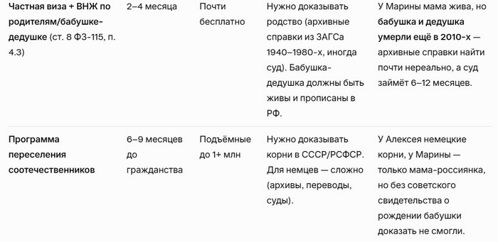 Сегодня семья живёт, можно сказать, временно ютится в той же купленной квартире, сделали небольшой ремонт. Расходы в месяц ≈ 110-130 тыс. руб. (аренда = 0, садик = 0, продукты ≈ 40 тыс., коммуналка 7 тыс., остальное на жизнь, на расходы, бытовку). С зарплаты остаётся больше, чем в Берлине после всех вычетов. В 2028 г. готовятся подавать на гражданство — по упрощённому порядку через 3 года (в 2028-м), — но уже сейчас всё, в принципе, как у местных: «Если бы знали, что так просто — уехали бы на 3-4 года раньше. Главное было просто купить хоть какую-то недвижку и не тянуть с документами, — заканчивает Алексей свою онлайн-реплику: — А расширяться — будем обязательно!» У читателей возникает резонный вопрос: дескать, а почему не вернулись просто как к родственникам-родитителям по воссоединению и т.д.? Ответ лучше дать в табличке: