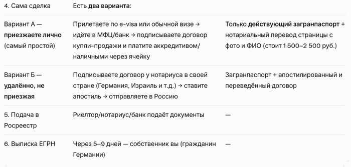 «Перевели деньги через крипту — на СПБ, потом — на счёт продавца, потеряв при этом ≈4 % на конвертации, — продолжает автор. — 15 апреля 2025 г. прилетели в ивано́вский Ёбург, где географом пропит глобус (любим его книжки), — чартером из Стамбула, т.к. прямого из Берлина уже нет. Въехали по загранпаспортам как туристы — 90 дней без визы для немцев уже не было, но сделали «единую электронную визу» («упрощёнку) за 3 дня онлайн — за $52. 18 апреля сдали докуметы на ВНЖ в новом миграционном центре на ул. Репина (Екатеринбург) по основанию «собственной недвижимости». В пакет входят: