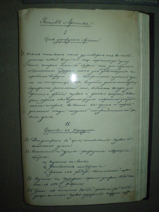 На общем собрании каторжников Петровского завода (а им местным начальством было милостиво дозволено ходить друг другу «в гости») декабристы организовали «Большую артель» и приняли её устав. В нём перечислялись аж тринадцать разделов и сто шесть(!) параграфов: