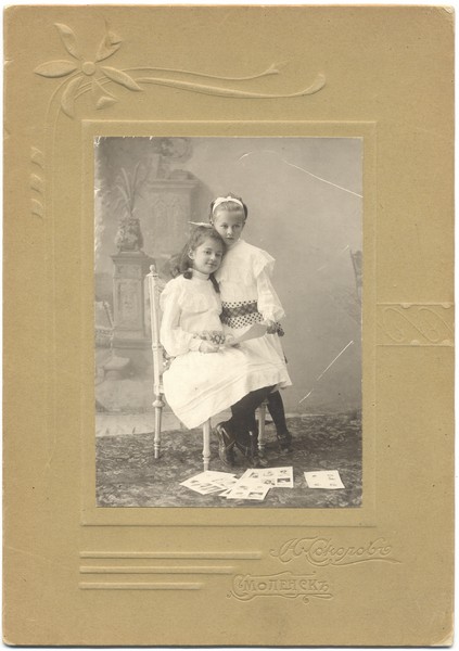 Две более поздние фотографии, тоже сделанные в фотоателье Н. Соколова, наглядно отражают движение времени, изменение эстетических приоритетов. На снимке, который можно отнести к 1904 г., судя по возрасту детей (Ольге 9 лет, Елене 5), уже новый дизайн паспарту, асимметрия свободных форм, шрифт, соответствующий стилю.