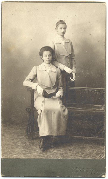 Другая, более поздняя фотография, 1910—1911 гг. (Ольге 15 лет, Елене 13), выполнена предельно сухо, только имя владельца ателье, город. Поля окончательно исчезли, зато на обороте логотип Н. Соколова в стиле «модерн», где снизу указано: «Фабр. J. Покорнаго Либава».