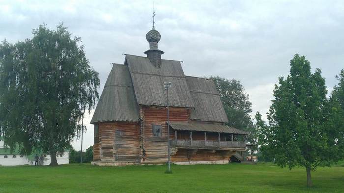 Издревле возводили в России из дерева не только крестьянские избы и хозяйственные постройки, но боярские и княжеские палаты, а также церкви, оборонительные сооружения. Для царских палат использовать дерево являлось не зазорным делом: вспомним роскошный деревянный дворец царя Алексея Михайловича в Коломенском. Деревянных боярских и княжеских палат тут, в суздальском музее, к сожалению нет, зато имеются две церкви и часовня, жилые крестьянские и купеческие дома, обязательно бани (а как же без неё, ведь и мылись здесь, и гадали, и рожали!), а также мельницы, овины, амбары. И всё построено, как издревле было принято, без железных гвоздей, за счёт вставлявшихся друг в друга деревянных конструкций, при помощи простого топора. Крайне любопытный экспонат — глубоководный колёсный колодец, — специально расположенный в центре территории музея, как и принято было в русских селениях. Колёсные колодцы создавали там, где вода таилась на значительной глубине. Чтобы извлечь водицу (делали это мужчины), нужно было встать внутри колеса и, вращая его ногами, вызвать движение вала, к которому на цепях прикреплялись здоровые бадьи для воды.