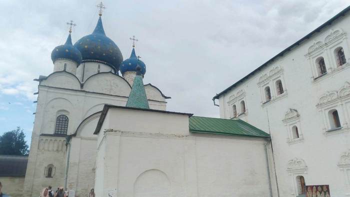 Большинство церквей Суздаля относится к XVIII столетию, однако сохранились куда более древние постройки, в их числе — Рождественский собор на территории Суздальского кремля — самой древней части города. Считается, что некогда на этом месте князь Владимир Мономах заложил храм Успения Пресвятой Богородицы, относящийся ещё к началу XII столетия. Он был возведён киевскими мастерами по образцу собора Киево-Печерского монастыря из плоского кирпича — плинфы, — традиционного строительного материала, пришедшего к нам из Византии. Рядом находились деревянные княжеские палаты, здесь же жили и глава местной церкви, епископ, княжеские дружинники.