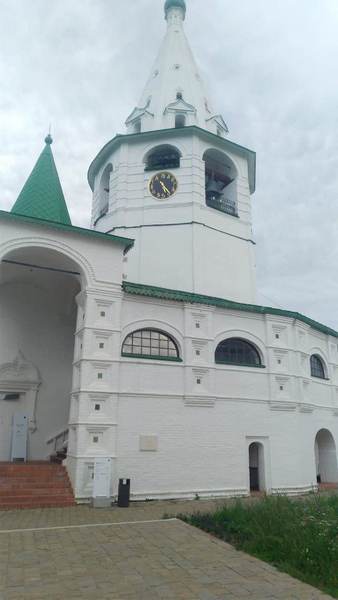 Напротив собора в первой половине XVII века возвели стройную колокольню, увенчанную элегантным шатром. Чрезвычайно интересны появившиеся здесь в конце XVII века красивые часы-куранты, время на которых указывается не привычными нам цифрами, а буквами, как и принято было в допетровской России, где каждый знак в алфавите имел не только собственно буквенное, но и цифровое значение. Сама стрелка в таких курантах не двигалась, а вращался сам циферблат, и только при Петре в России появилась европейская система с арабскими цифрами и подвижными стрелками.