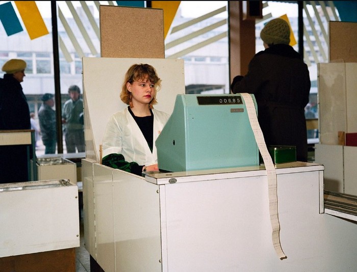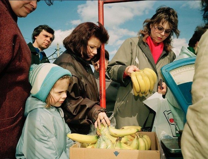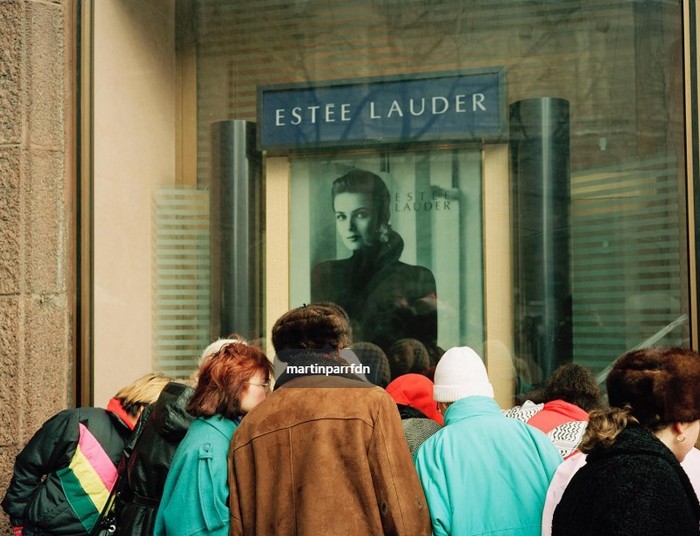 Первые признаки капитализма. Реклама «МММ», кооперативные кафе, уличные торговцы джинсами Levi’s и кассетами Modern Talking. Цвет — насыщенный, почти ядовитый: из-за вспышки и плёнки Kodak Gold. Ирония и юмор, но без злобы — Парр показывает абсурд переходного момента с любовью. Крупные планы лиц, детали одежды, еды, вывесок. Тот же взгляд «антрополога-иностранца», что и в его английских сериях. Впервые серия была опубликована в немецком журнале Stern в 1990 году. Потом вошла в книгу Small World-1995 (расширенное издание в 2007-м). Полностью серия вышла отдельной книгой только в 2023 г. — «Moscow 1990», издательство RRB Photobooks.
