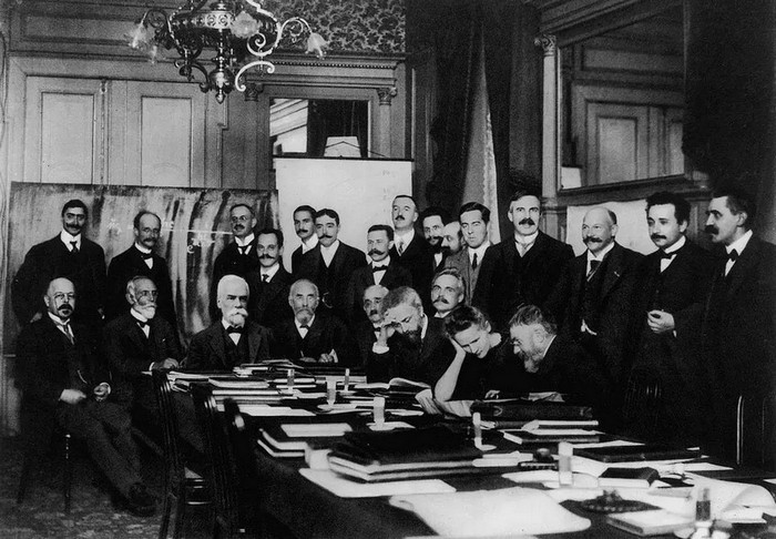 Вильгельм Вин, Мария Склодовская-Кюри и Анри Пуанкаре. Стоят (слева направо):