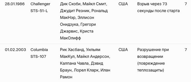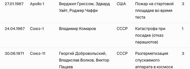 - США — 17 астронавтов погибли: 3 на стартовой площадке + 14 во время миссии.