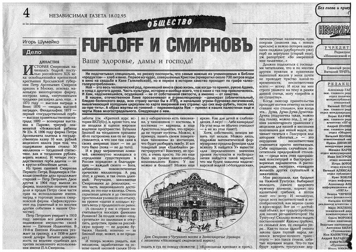 Статью «Смирновъ и Fufloff» (тем «термином» я и объединил тогдашние потоки евро-«фуфла» и Smirnoff-ки) в «Независимой газете» снимали несколько раз. Звонки главреду Виталию Товиевичу Третьякову: «Вы подрываете российский спорт!» Фирма «Хьюблайн» дала что-то около 200 долларов на проезд женской сборной по волейболу до Литвы и обратно.