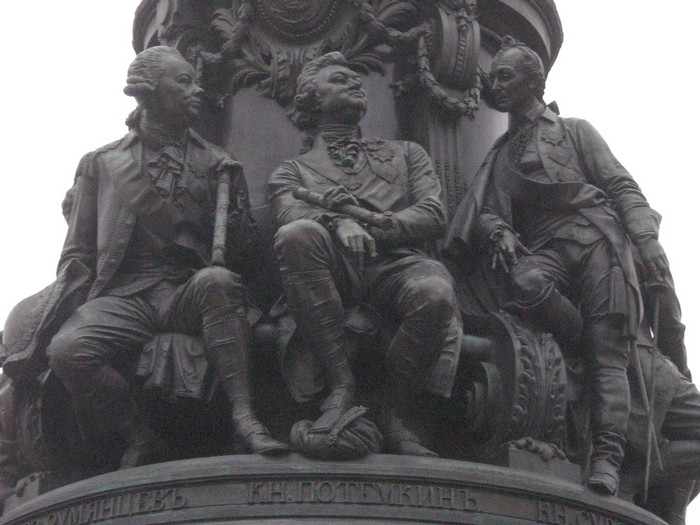 Потёмкин (в центре) на постаменте памятника Екатерине II в Санкт-Петербурге