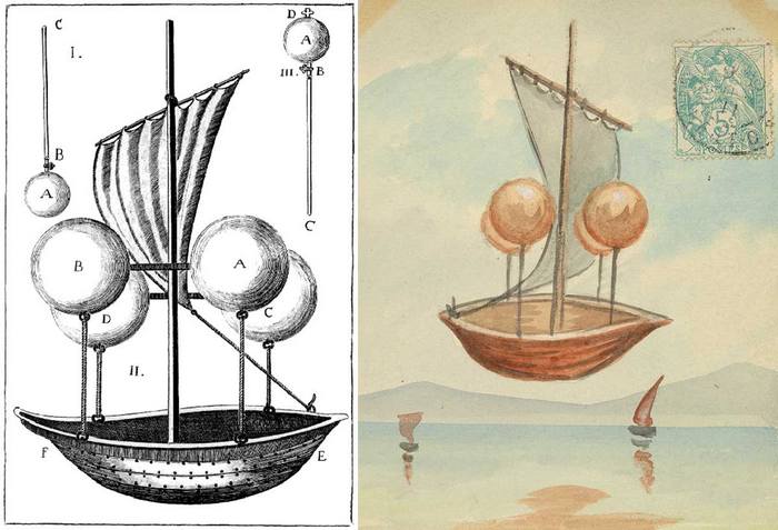 Итальянский иезуит и учёный Франческо Лана де Терци в XVII веке предложил оригинальную концепцию летающего аппарата. Его проект состоял из лодки с парусом на центральной мачте и четырёх больших сфер из тонкой медной фольги, прикреплённых к другим мачтам. Идея заключалась в создании внутри сфер вакуума — за счёт откачки воздуха они должны были становиться легче окружающего воздуха и обеспечивать подъёмную силу. К сожалению, в реальности такие тонкостенные шары мгновенно разрушались под давлением атмосферы, поэтому проект остался лишь на бумаге до появления более подходящих газов для подъёма.