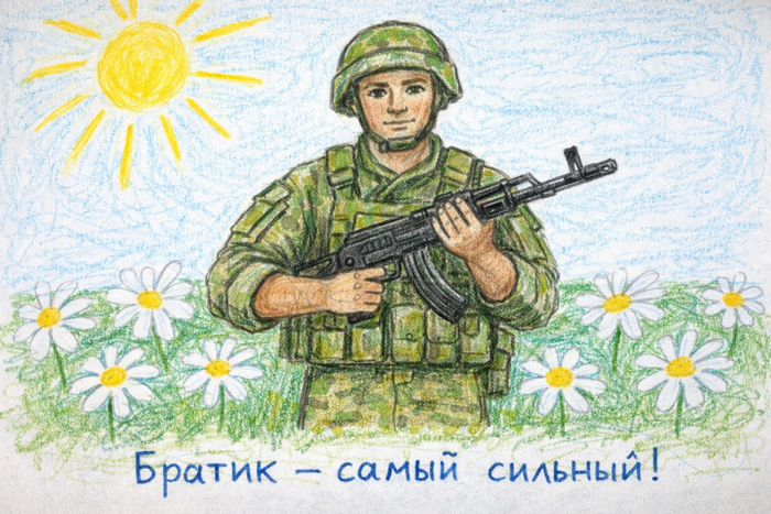Младшая 13-летняя сестра Лерка весь вечер крутилась рядом, трогала его рукав, будто проверяла, настоящий ли. Резко вдруг убежала в свою комнату и вернулась с листом А4 — на нём изображён брат, в каске, с автоматом, а вокруг почему-то ромашки и солнце. Подпись внизу детским почерком: «Братик — самый сильный!». — Витька посмотрел на рисунок и впервые за полтора года почувствовал: в горле ком.