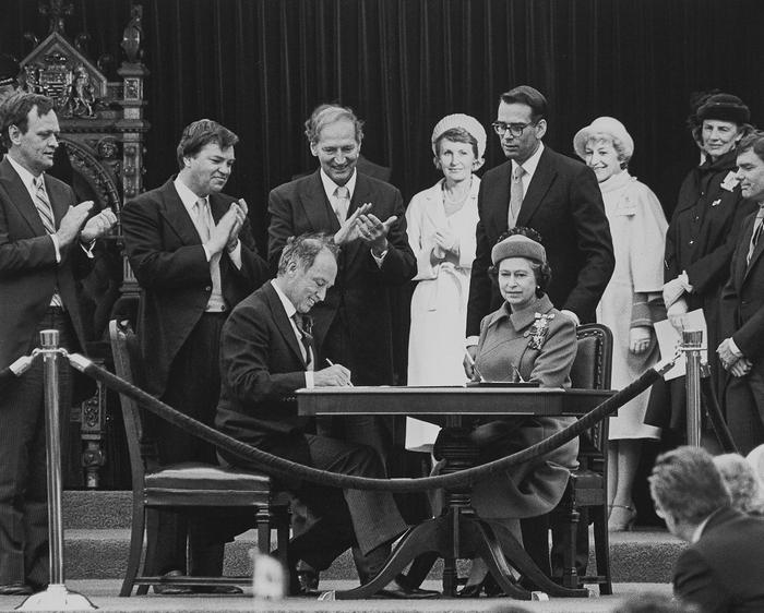 Королева Елизавета II и Пьер Эллиот Трюдо подписывают Канадскую конституционную прокламацию.