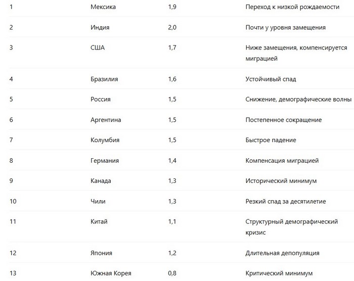 Ни одна из крупных индустриальных экономик не достигает уровня простого воспроизводства 2,1. Даже Индия, традиционно ассоциировавшаяся с демографическим взрывом, фактически завершила переход к низкой рождаемости. США и Канада демонстрируют схожий тренд, однако США удерживают более высокий показатель благодаря устойчивой миграции, религиозно-культурной неоднородности, более молодой возрастной структуре. Канада — находится ближе к европейской модели демографического сжатия. Мексика, Бразилия, Аргентина и Колумбия за два десятилетия прошли путь, на который Европе потребовалось полвека. Это один из самых быстрых демографических переходов в мировой истории.