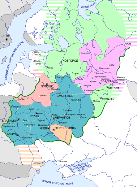 Тёмно-зелёным отмечены княжества, пославшие войска на Калку