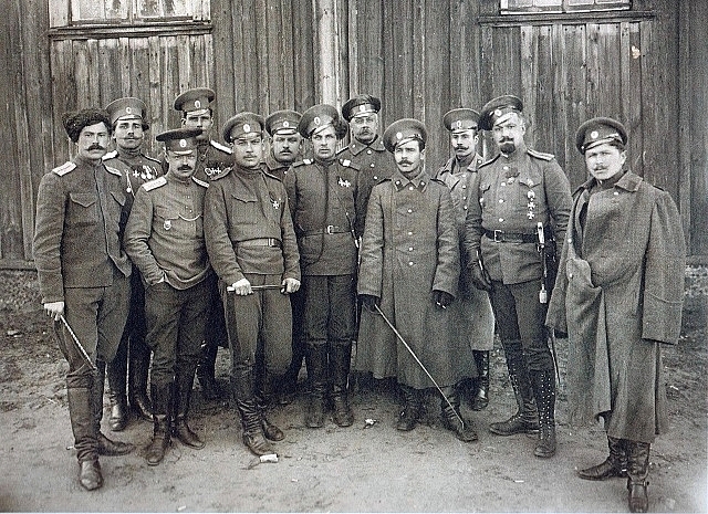 Козьма Крючков в центре, среди других Георгиевских кавалеров, с двумя наградами