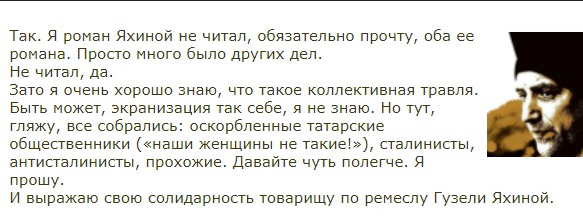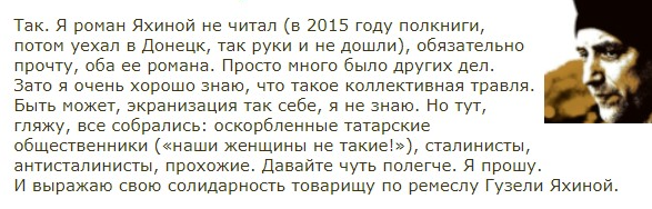 Потом прошло лет пять, и Евгений Николаич о своей рекомендации напрочь позабыл. На беду, вышел сериал по мотивам глубокого и убедительного романа. Отсмотрев пару серий, ваш покорный слуга выпучил глаза и принялся за чтение литературной основы — тем более наткнувшись при поиске текста на такую рекомендацию мэтра. Итогом была подробная рецензия, зачин которой («Эту книгу меня уговорил прочесть литератор и публицист Захар Прилепин») практически совпадает с зачином рецензии настоящей. Так как пришлось на примерах из текста высветить постыдные глупость, неумелость и откровенную враждебность буквовыделения «писателя Гузель», к мэтру-рекомендателю у публики появились вопросы. Но мэтр, как уже было сказано, забыл про всё былое и честно признался в своем блоге: