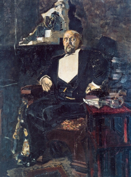 Вальяжно чувствующий себя в жизни С. Мамонтов: не выдворить из неё, ведь он — из хозяев, и его взгляд на портрете, сделанном Врубелем, свидетельствует об этом.