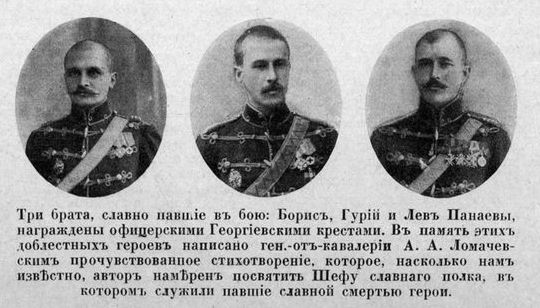Из мемуаров М.К. Лемке «250 дней в царской ставке»: «…Сегодня был подписан рескрипт на имя военного министра о даровании матери трёх героев Панаевых, пенсии в три тысячи рублей и ордена Святой Ольги...»