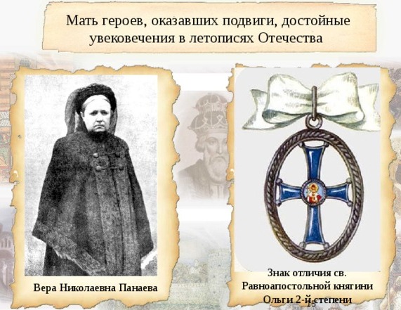 Награду учредили, а вот людей, ответственных за представление к этой награде, так толком и не назначили. Время лихое — военное, тут только и успевай, что наградные листы для отличившихся офицеров и солдат готовить. В общем, — не до особ женского пола. Годы шли, но на стол государя так ни одно представление к знаку Святой Равноапостольной княгини Ольги не ложилось. До тех пор, пока в газетах не появились статьи о простой русской женщине Вере Николаевне Панаевой, внучке русского офицера, дочери русского офицера и матери четырёх офицеров. (Трое из которых служили в одном полку. Да не в простом, а в Ахтырском, гусарском имени самого Дениса Давыдова!)