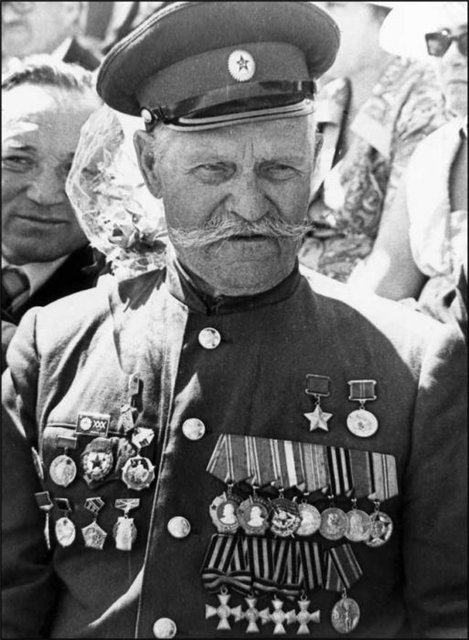 Он, поправив поседевшие казацкие усы, выхаживал строевым шагом мимо мавзолея, залихватски отдавая честь. (За обе войны — одиннадцать раз раненный и получивший тяжёлую контузию!)