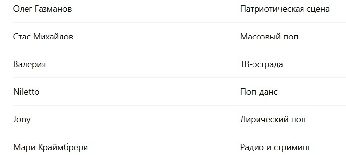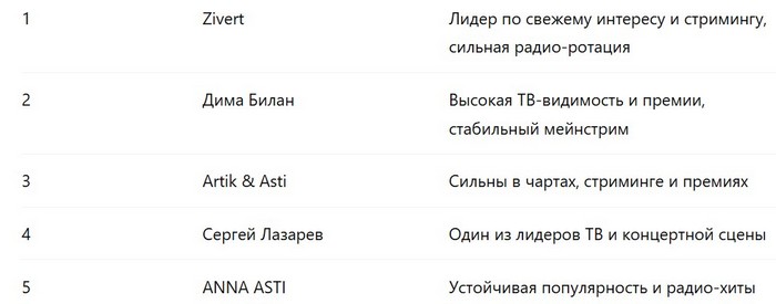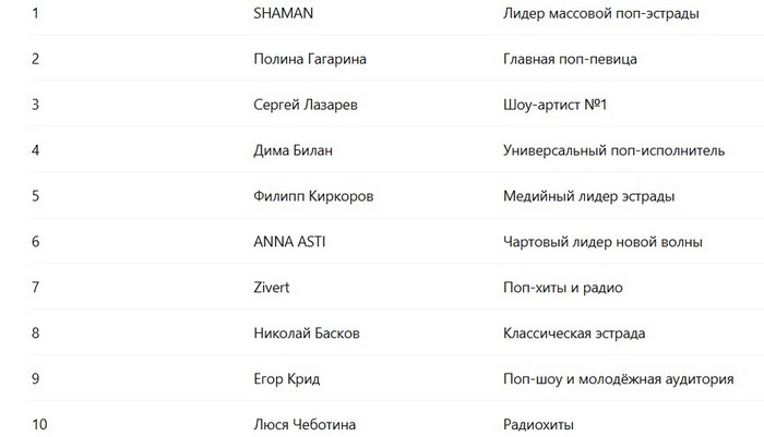 Тенденцию на «старичков» вполне можно понять: Новый год, зимние празднества, снежные бабы, масленица и т.д. И вот подсобрал свежий весенний топ-список. Любопытно, что Шамана в нём уже нету. И да... Хочу добавить, что это мой сугубо любительский «ручной список», не претендующий на совсем уж суперточность. Частично использовал сводные показатели, учитывающие стриминг, соцсети, поиск, интерес к концертам-медиа etc. Посему позиции здесь — не «чистый чарт», а именно «ручной», повторюсь, срез общей популярности...
