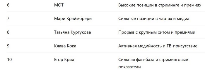 Совсем рядом с топ-10 находятся: Люся Чеботина, JONY, «Руки Вверх!», Ваня Дмитриенко. У всех есть сильные аргументы вроде того как: у JONY — «Радио-артист года» на «ЖАРЕ», у Люси — «Шоу года», у «Руки Вверх!» — «Группа года» на «ЖАРЕ» и «Концерт года» на «Виктории», у Вани Дмитриенко — победа в сетевой номинации МУЗ-ТВ 2025.