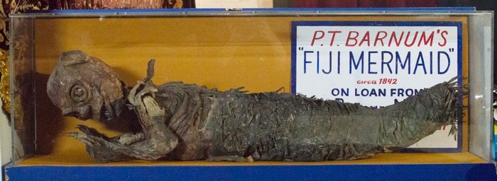 «Русалка Фиджи». Один из первых громких успехов Барнума. Он выставил на визуальную продажу зрителю якобы «настоящую русалку». На деле то была склеенная мумия: верх — обезьяна, низ — рыба. Барнум запустил слухи через «учёных» и газеты. Люди шли толпами, хотя многие догадывались, что это чушь, подделка.