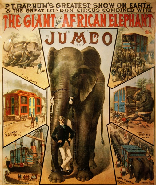 «Джамбо» — гигант как бренд. Барнум купил огромного слона по кличке Джамбо. Превратил его в глобальный бренд — слово jumbo стало синонимом «гигантский». Вокруг слона строилась реклама и легенды: по лекалам маркетинга в современном смысле.