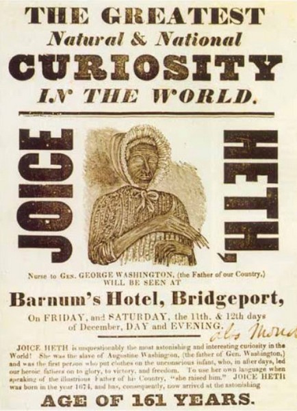 В середине 1830-х Барнум объявил, что обнаружил бывшую няню Джорджа Вашингтона — Джойс Хет, якобы прожившую невероятные 160 лет. Женщину, слепую и почти парализованную, он взял у перекупщиков за тысячу долларов, — колоссальную по той поре сумму: — и немедленно превратил в гастролирующую сенсацию. Толпы выстраивались, чтобы услышать, как «няня президента» слабым голосом рассказывает о «маленьком Джорджике». После чего звучал гимн — и зрители уходили, убеждённые, что прикоснулись к живой истории. Шоу приносило до полутора тысяч долларов в неделю — фантастические деньги для той эпохи.